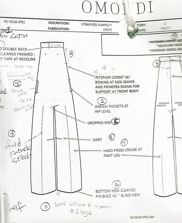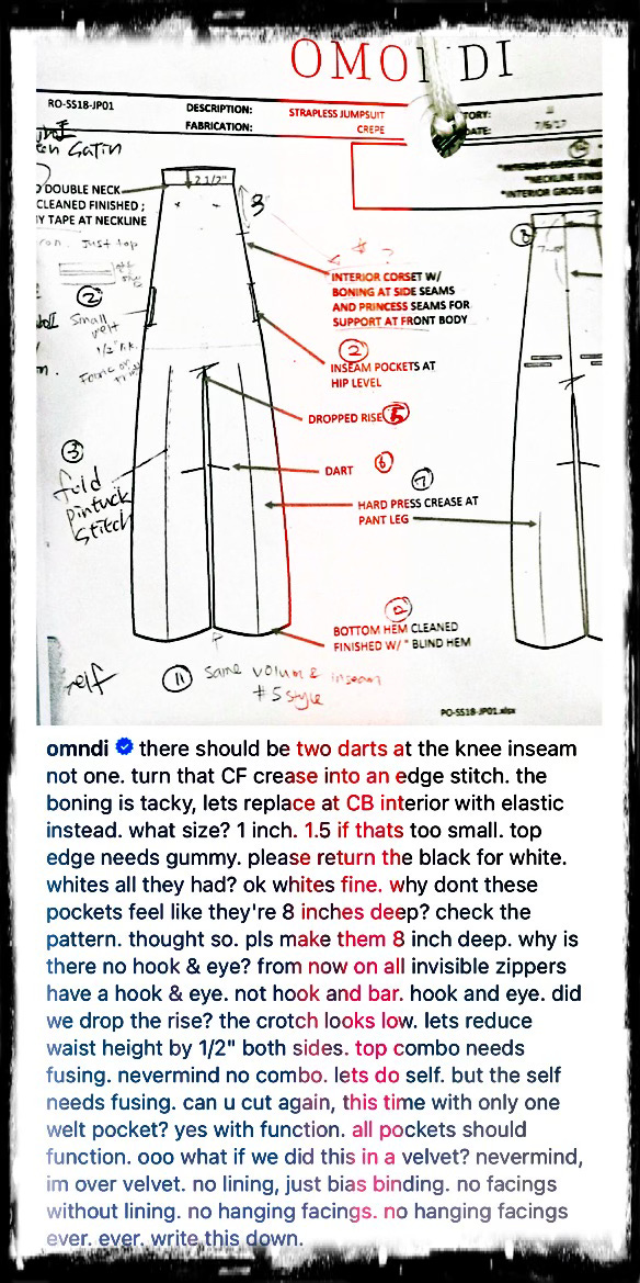 Omondi, R. [@omndi]. (2017, Oct. 3). There should be two darts at the knee inseam not one. Turn that CF crease into an edge stitch. [Photograph]. Instagram.